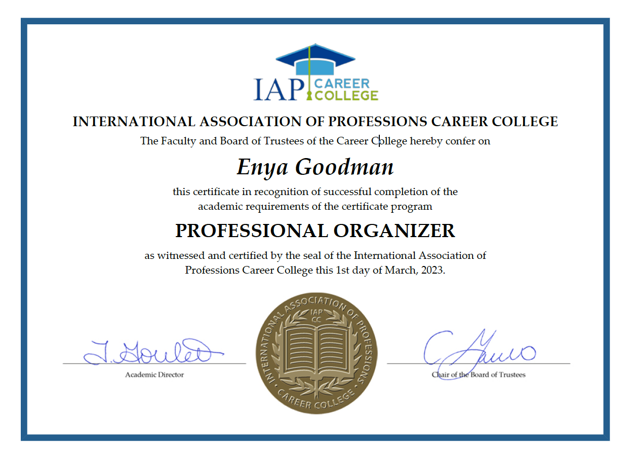 In 2022, I graduated from university and began working in marketing. However, I soon realized that my true passion lay in fostering positive changes in people’s lives. This realization inspired me to follow my dream of becoming a professional organizer. To expand my expertise, I pursued a course at IAP College and earned my certification as a professional organizer in March 2023.